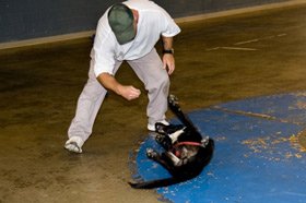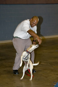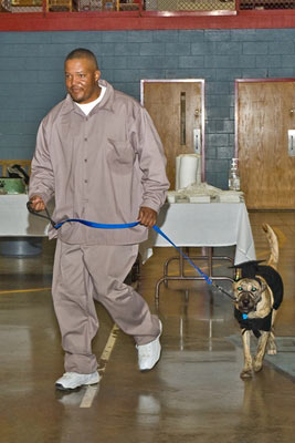 Inmate trainer D. Smith teaches Amos to roll over.Right: