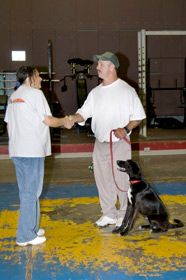 Barb McNinch and D. Smith practice for Canine Good Citizenship testing.