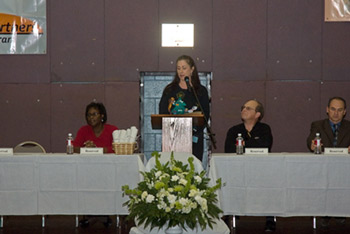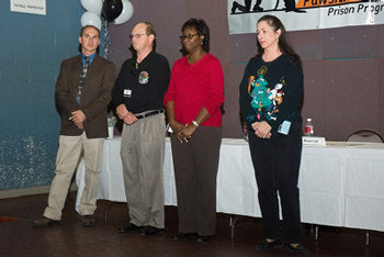 Barb Raab, (standing) Monty's Home President, addresses the graduation crowd. She's flanked by (L-R) Dianne Moore, Correctional Case Manager Supervisor, Michael T. W. Bell, Correctional Administrator I and Bryan Wells, Assistant Superintendent/Programs.