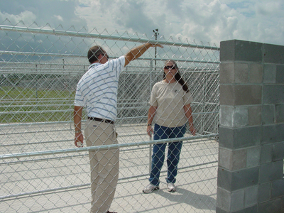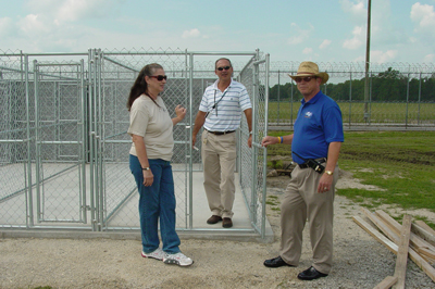 | Barb Raab, Monty's Home Founder, Brian Wells, Assistant Superintendent of Programs and Michael Bell, Correctional Facility Administrator look over the program kennels at Pender Correctional Institution in Burgaw, NC. | Bryan and Barb discuss the next phase of construction. |