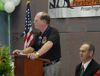 | Michael Bell, Correctional Facility Administrator, addresses the crowd while Bryan Wells, Assistant Superintendent of Programs listens intently. (Both men helped make this day possible. | The crowd looks on as Barb Raab, Founder of Monty's Home, shares information about the dedication and hard work it took to bring the program to the prison. "I'm like a little kid at Christmas today." |