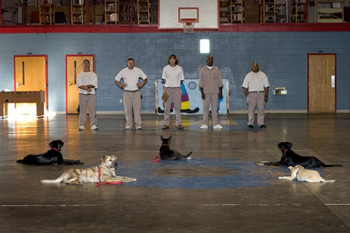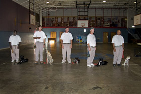 The inmate trainers and their dogs await further instruction.Left: