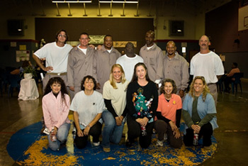 | Inmates and their dogs get acquainted, oblivious to the visitors and festivities around them. |